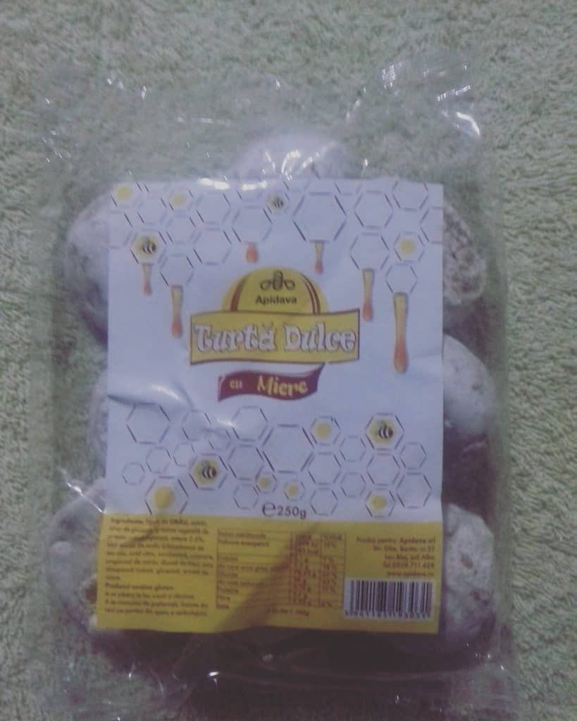 Lucru deja stiut: produsele Apidava dispar cat ai zice miere. Dupa-amiaza inorata fiind, abia am reusit sa pozez produsele inainte sa dispara turta dulce. Asa ca e de inteles de ce poza nu e prea grozava. Dar turta dulce cu miere de la Apidava este! Doamne, nu poti lasa din mana punga! 250 de grame de placere pura.