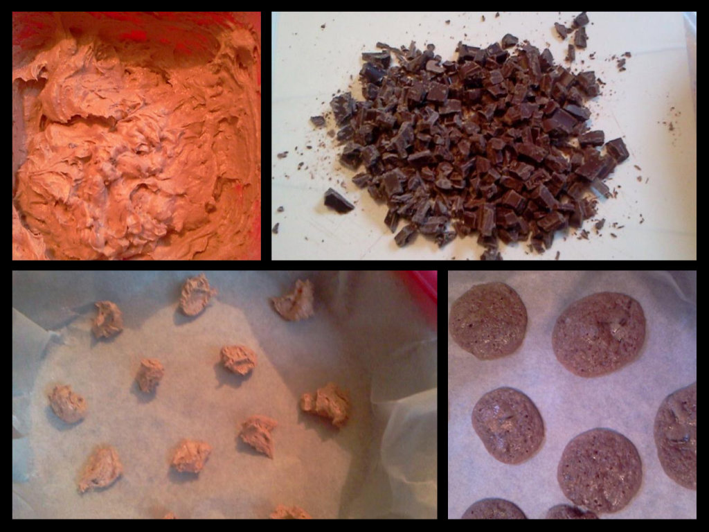 Se mixeaza untul cu zaharul pana ce zaharul se topeste , se adauga ouale pe rand amestecand dupa fiecare ca sa nu se taie, apoi amestecam si ciocolata (taiata cu cutitiul cubulete NU RASA), faina si cacaua cernuta prin sita cu praful de copt,apoi adaugam si esenta de rom cu grija( putem folosi doar jumatate din esenta). Incingem bine cuptorul,asezam hartie de copt pe o tava si punem incet din aluat cam o jumatate de lingurita rasa,nu mult pentru ca riscam ca fursecurile sa se lase,le punem la o distanta destul de mare una fata de cealalta cam 3 cm (mie imi intra 11-12 intr-o tava mare de aragaz). Tinem la cuptor circa 8-10 min.Se sevesc calde sau reci .Copii mei le adora. Pofta buna:)!