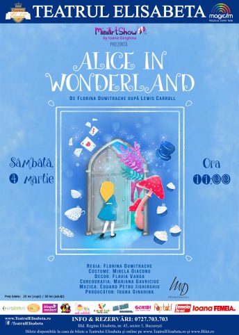 „Alice in Wonderland” este un spectacol dedicat copiilor începând cu 4 ani, dar și întregii familii, având o distribuție de excepție, muzică originală și proiecții multimedia care vor transforma sala din CinemaPro într-un tărâm  fermecat.