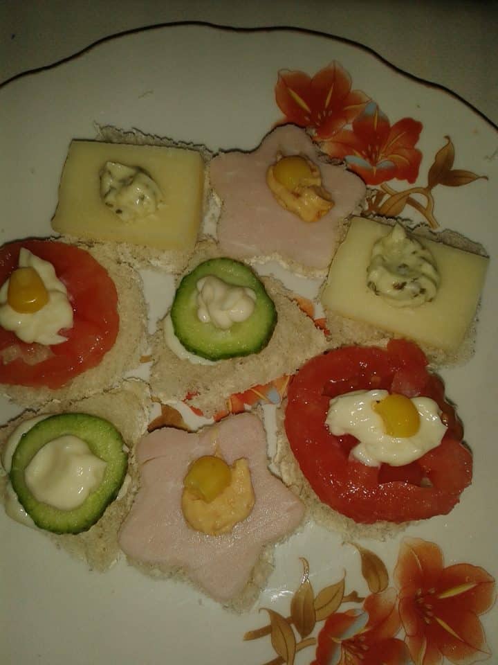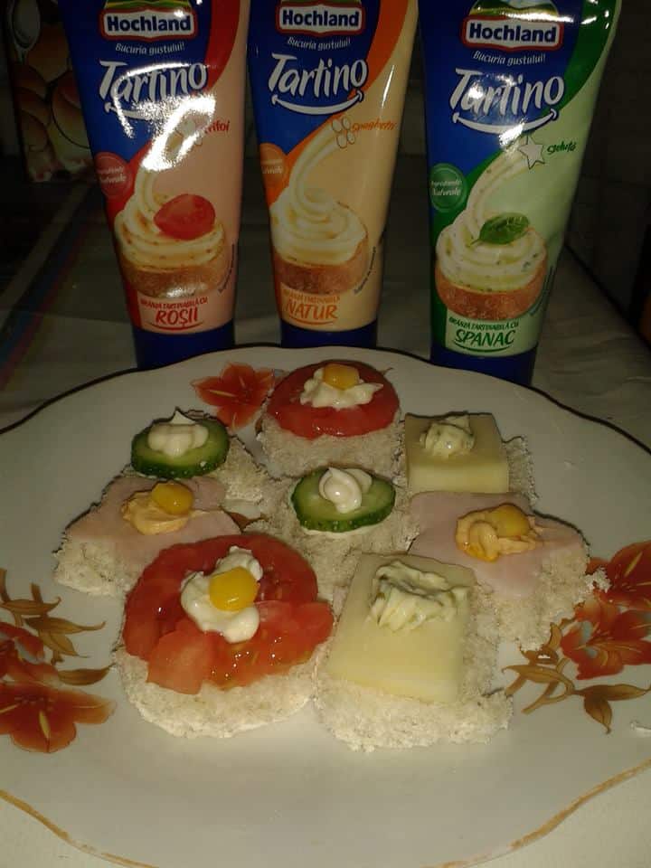 Si pentru ca bucuriile trebuie impartasite cu cei dragi noi ne-am hotarat sa realizam un soi de atelier de creatie gastronomica, la care ne-am chemat verisorii. Copiii au dovedit imaginatie, asa ca au ales sa taie painea in diverse forme pe care le-am sendvisuit dupa gust, adaugand din toate cele 3 sortimente de Tartino, plus cascaval, sunculita, rosii, castraveti, porumb. Iata ce a iesit: